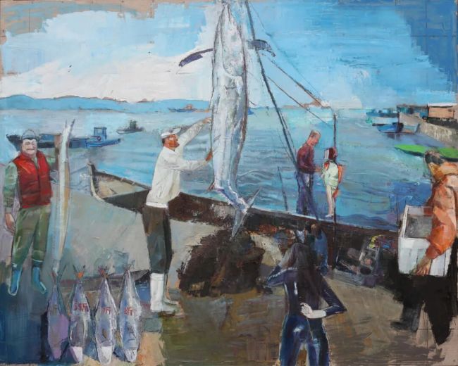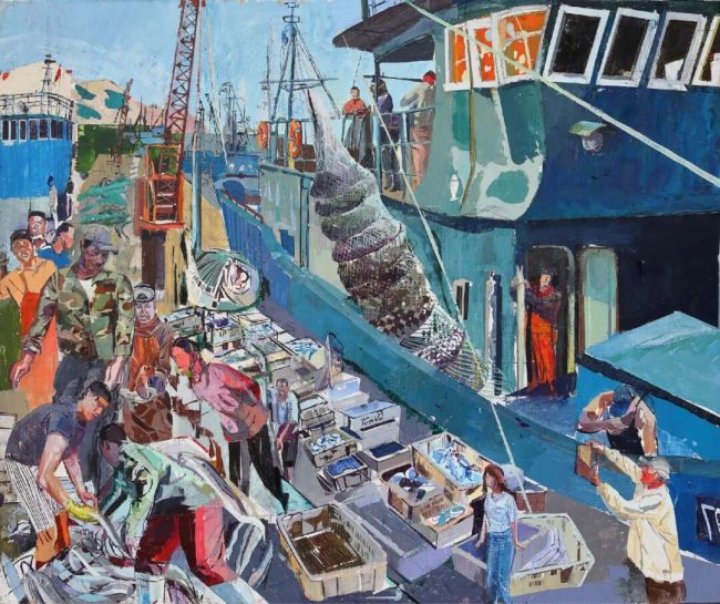 王晓欧将绘画视为承载前史与团体回忆的物质载体。好像安塞姆·基弗用铅铁、稻草、灰烬构建画面的沉重感,王晓欧的著作也着重物质的在场感。他将这种视觉语法应用于其最了解的渔民体裁。在他所构建的视觉国际中,咱们常常能够观察到集合的船舶、堆积的方形塑料筐、数量很多的鱼等等。尤其是盛满了“战利品”的白色方形塑料筐,它的造型安稳健壮,像是构筑房子的柱石一般,构建起画面的根底。